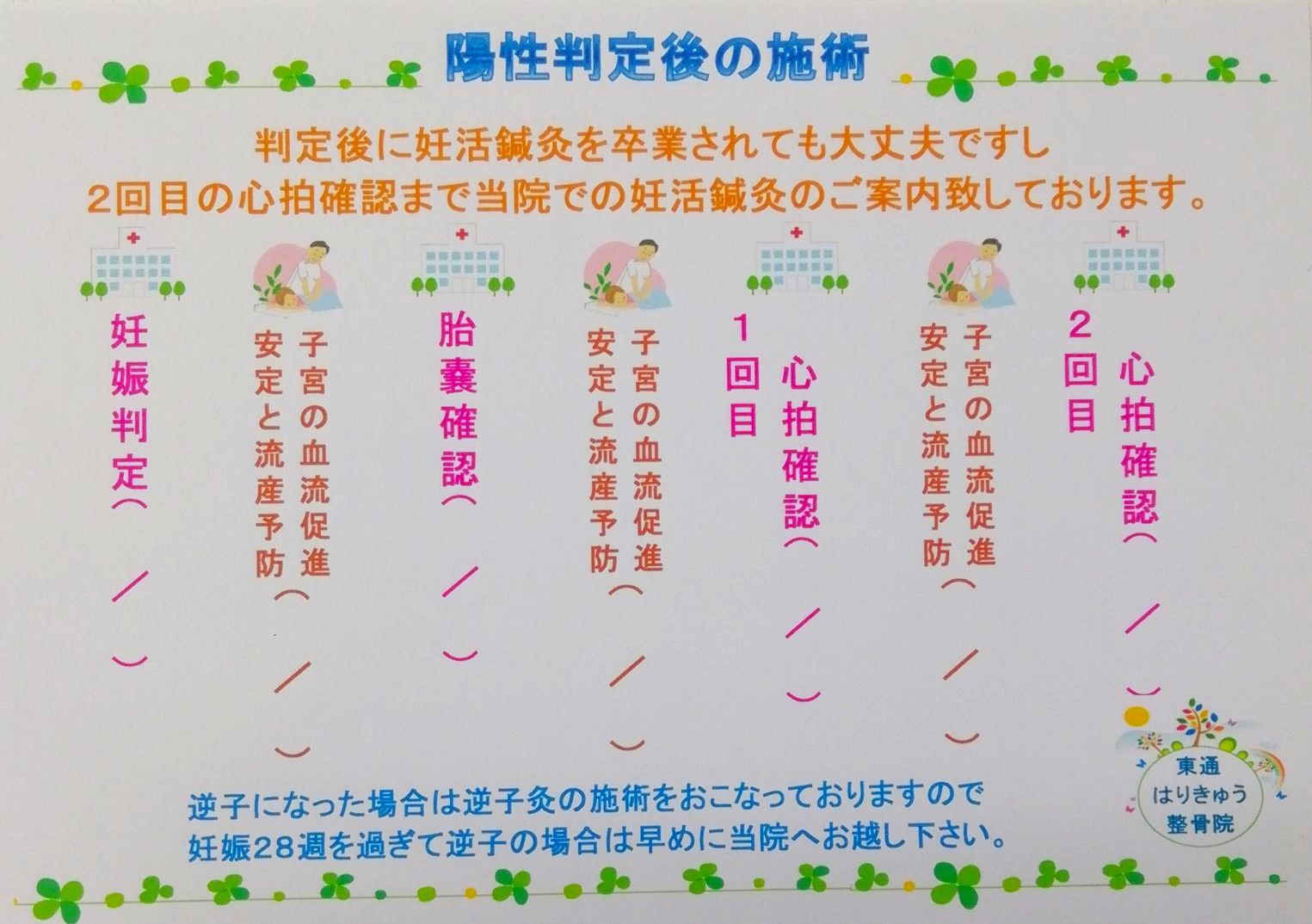 不妊症・不妊体質の改善 習慣性流産など鍼灸の総合治療 初診料: 2.000円 (初回のみ、別途に頂きます) 施術料金: 5.500円 (1回約50分~60分) 初回 初診料+施術料金 ¥7,500円 2回目以降 施術料金 ¥5,500円 お恐れいれますがクレジットや 電子マネーに対応しておらずお支払いは 現金のみになりますのでご了承下さい。 体質改善のため通うペースは定期的に1・2週間に 1回、月に1回と皆様ご自分の好きなペースで通って 頂いております。 手足や骨盤周りなど全身の体質改善 ホルモンバランス調整の施術をいたします。 基本的に体質改善のため継続して通う事をお勧め 致しますが タイミング法・人工授精・体外移植の 前後のみの不妊治療もお受けいたしております。 ※その場合はタイミング・人工・採卵・胚移植の 日程に合わせて個人差もありますが2回~5回 来院して頂き施術いたします。 お気軽にお問合せ下さい ※ラインにて当日予約や問合せ 休診日や時間外でも受付対応致しております。